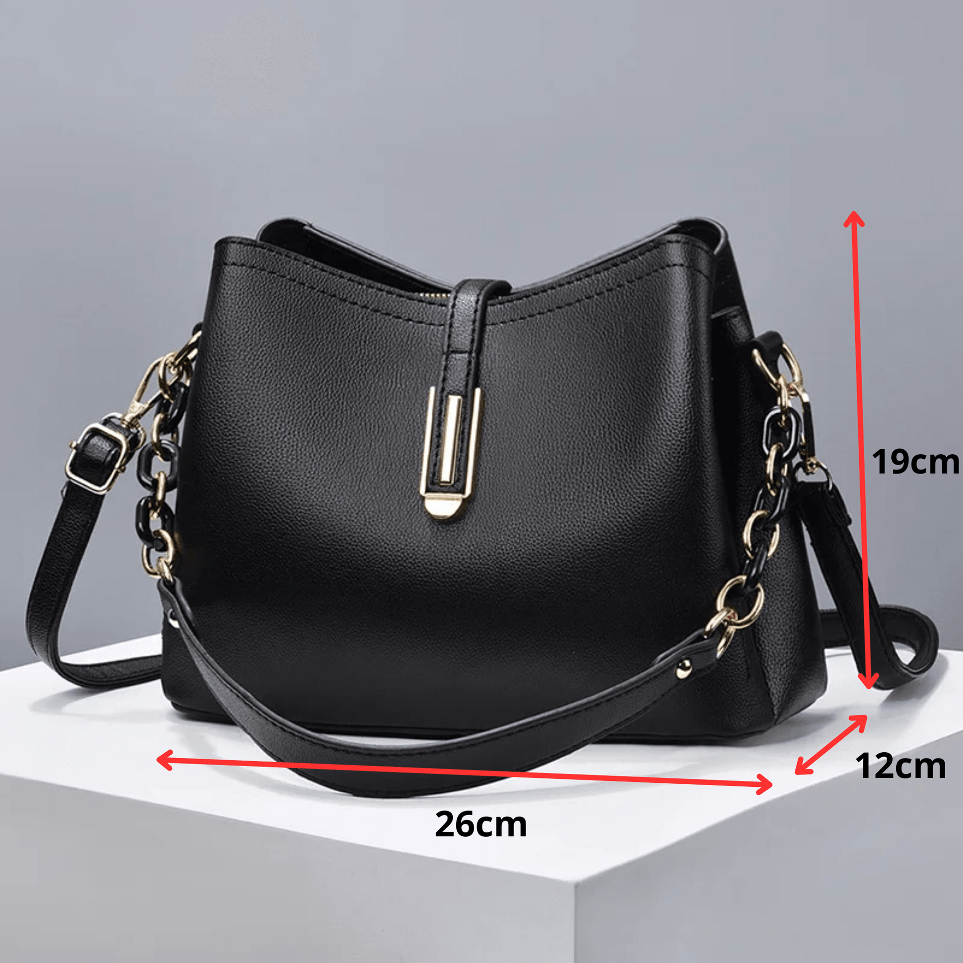 Seu interior espaçoso permite organizar seus itens essenciais com praticidade, enquanto o fecho sofisticado e os detalhes dourados garantem um toque de exclusividade.